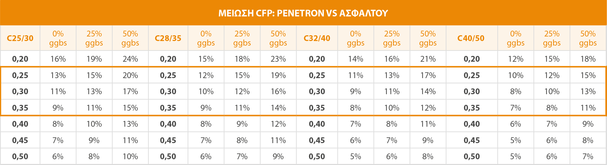 Πραγματοποιήθηκαν δοκιμές ανθεκτικότητας σκυροδέματος υπό προσβολή διείσδυσης χλωριόντων και ενανθράκωσης, με μέγιστη τιμή CFP για το PENETRON ADMIX 4,9 kg qCO2/m³.¹